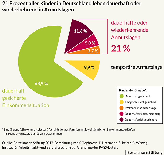 Rund 21 Prozent aller Kinder in Deutschland leben über eine Zeitspanne von mindestens fünf Jahren dauerhaft oder wiederkehrend in einer Armutslage. Für weitere 10 Prozent ist dies ein kurzzeitiges Phänomen. Zu diesen Ergebnissen kommt eine neue Studie des Instituts für Arbeitsmarkt- und Berufsforschung (IAB) im Auftrag der Bertelsmann Stiftung. "Kinderarmut ist in Deutschland ein Dauerzustand. Wer einmal arm ist, bleibt lange arm. Zu wenige Familien können sich aus Armut befreie", so Jörg Dräger, Vorstand der Bertelsmann Stiftung.