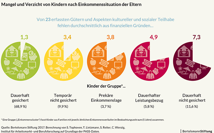 Armut bedeutet in Deutschland meist nicht, kein Dach über dem Kopf oder kein Essen zu haben - die existenzielle Grundversorgung ist in der Regel gewährleistet. Armut heisst aber, auf vieles verzichten zu müssen, was für andere ganz normal zum Aufwachsen und Leben dazu gehört. Um solche Verzichtserfahrungen von Kindern in armen Familien greifbar zu machen, wurde für 23 Güter und Aspekte sozialer Teilhabe abgefragt, ob diese in den Familien aus finanziellen Gründen fehlen. Die Liste umfasst eine ausreichend grosse Wohnung, eine Waschmaschine oder einen internetfähigen Computer, aber auch die Möglichkeit, monatlich einen festen Betrag sparen zu können. Auch Aspekte sozialer und kultureller Teilhabe sind berücksichtigt, wie zum Beispiel ein Kinobesuch einmal im Monat oder Freunde zum Essen nach Hause einzuladen. In der Summe fehlen Kindern in einer dauerhaften Armutslage durchschnittlich 7,3 der abgefragten Güter. Kinder, die temporär in einer Armutslage leben, müssen im Schnitt auf 3,4 Güter verzichten. Zum Vergleich: Bei Kindern aus Familien mit dauerhaft sicherem Einkommen fehlen nur 1,3 dieser 23 Güter aus finanziellen Gründen.