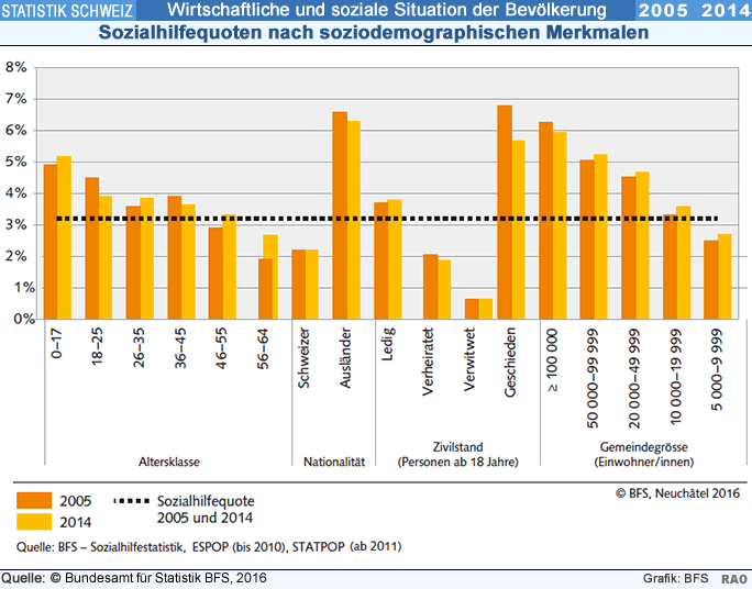 Die Schweizerische Sozialhilfestatistik umfasst mit den aktuellsten Daten des Jahres 2014 zehn Beobachtungsjahre. Die Sozialhilfequote betrug 2005 wie auch jetzt 3,2 Prozent. Im Zehnjahresvergleich bestätigen sich Beobachtungen aus früheren Jahren: So sind weiterhin Kinder, Ausländerinnen und Ausländer, Geschiedene und Personen ohne nachobligatorische Ausbildung einem erhöhten Sozialhilferisiko ausgesetzt.