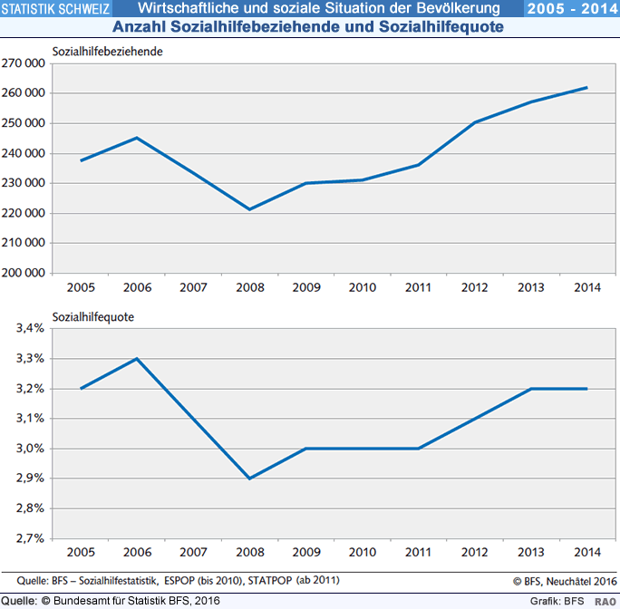 Die Zahl der Sozialhilfebeziehenden ist im Zeitraum von 2005 bis 2014 um 10 Prozent von rund 238'000 auf 262'000 Personen angestiegen. Nimmt man die Sozialhilfequote als Mass des Sozialhilferisikos, relativiert sich aber der Anstieg der Fallzahlen. Aufgrund des gleichzeitigen Bevölkerungswachstums liegt die Sozialhilfequote 2014 bei 3,2 Prozent wie im Startjahr 2005.