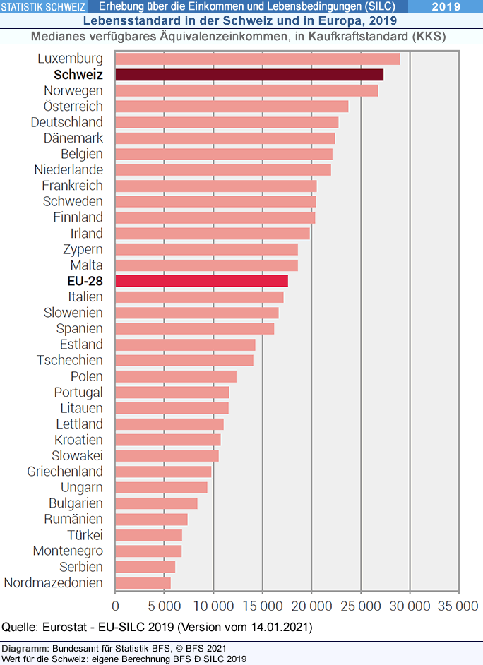 Im Jahr 2019 lag die Einkommensungleichheit in der Schweiz unter dem europäischen Durchschnitt: Das verfügbare Einkommen des einkommensstärksten Fünftels der Bevölkerung war 4,8-mal so hoch wie jenes des einkommensschwächsten Fünftels (Quintilverhältnis S80/S20). Je höher diese Zahl ist, desto ungleicher ist die Einkommensverteilung in einem Land. In Europa variierte der Indikator 2019 zwischen 3,3 (Tschechien und Slowakei) und 8,4 (Türkei) und betrug durchschnittlich 5,1.