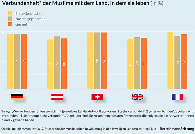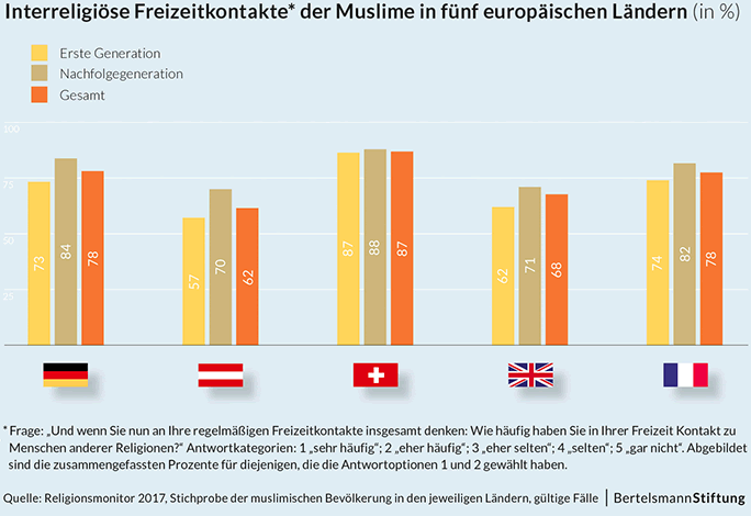 Die bisher bereits erzielten Erfolge in der Integration lassen sich auch daran ablesen, dass 84 Prozent der in Deutschland geborenen Muslime ihre Freizeit regelmässig mit Nicht-Muslimen verbringen. Fast zwei Drittel der Muslime geben an, dass ihr Freundeskreis mindestens zur Hälfte aus Nicht-Muslimen besteht. Jeder zweite Muslim hat einen deutschen Pass und 96 Prozent von ihnen betonen ihre enge Verbundenheit mit Deutschland.