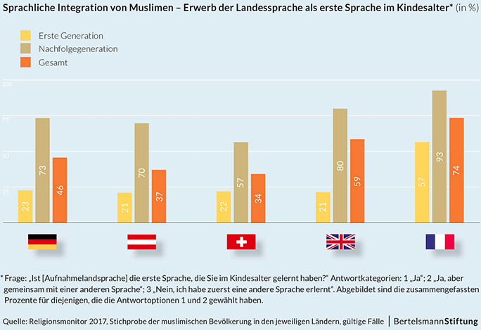 Mit Deutsch als erster Sprache wachsen 73 Prozent der in Deutschland geborenen Kinder von muslimischen Einwanderern auf. Ihr Anteil steigt von Generation zu Generation. Das gilt auch für das Niveau der Schulabschlüsse. Die Angleichung an die durchschnittliche Schulabschlussquote aller Schüler verläuft in Deutschland allerdings langsamer als etwa in Frankreich. Dort verlassen nur elf Prozent der Muslime vor Vollendung des 17. Lebensjahrs die Schule. In Deutschland gilt das für 36 Prozent.