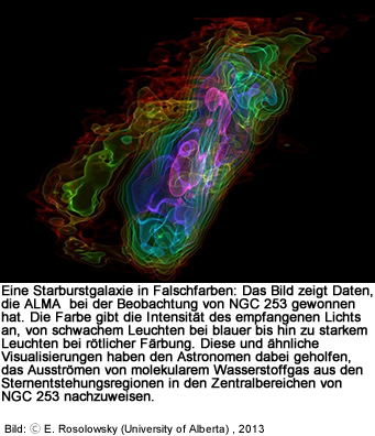 Astronomen gehen seit längerem davon aus, dass überreichliche Sternproduktion in der Gegenwart die Möglichkeiten einer Galaxie einschränkt, auch in Zukunft Sterne zu erzeugen. Nun hat ein Team, zu dem auch Fabian Walter vom Max-Planck-Institut für Astronomie gehört, die ersten detailreichen Bilder dieser Art selbstlimitierenden galaktischen Verhaltens aufgenommen: molekulares Gas, Rohmaterial der Sterngeburt, das aus den Sternentstehungsgebieten in der Sculptor-Galaxie (NGC 253) strömt. Die Beobachtungen gelangen mit dem jüngst in Betrieb genommenen Verbundteleskop ALMA in Chile.