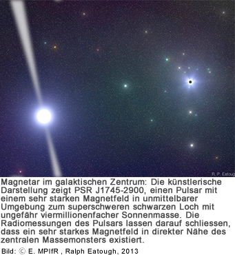 Im Zentrum unserer Milchstrasse haben Astronomen einen Magnetar aufgespürt. Dieser Pulsar besitzt ein extrem starkes Magnetfeld und ermöglicht es, die direkte Umgebung des schwarzen Lochs im Herzen der Galaxis zu studieren. Forscher unter Leitung des Bonner Max-Planck-Instituts für Radioastronomie haben zum ersten Mal die magnetische Feldstärke um die Zentralquelle bestimmt und nachgewiesen, dass sie mit Magnetfeldern gefüttert wird. Diese regulieren zudem den Masseneinstrom in das schwarze Loch und erklären die beobachtete Strahlung dieser Schwerkraftfalle.