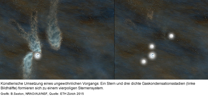 Ein internationales Team von Astrophysikern ist Zeuge eines besonderen Ereignisses geworden: Im Sternbild Perseus entdeckten Forscherinnen und Forscher erstmals die Entstehung eines vierpoligen Sternensystems, das sich aus weit auseinanderliegenden Fragmenten einer fadenförmigen Gaswolke bildete. Das Sternensystem besteht aus einem noch jungen Stern, der sich in einer frühen Entstehungsphase befindet, und aus drei kondensierenden Gaswolken, die durch Gravitationskräfte rasch verdichtet werden. Berechnungen der Astrophysiker zufolge wird sich jede der Gaswolken in 40'000 Jahren zu einem Stern formieren. Die Sterne dürften relativ klein sein und nur rund einen Zehntel der Masse unserer Sonne erreichen. Der Abstand zwischen den einzelnen Sternen beträgt mehr als das Tausendfache der durchschnittlichen Distanz zwischen Sonne und Erde.