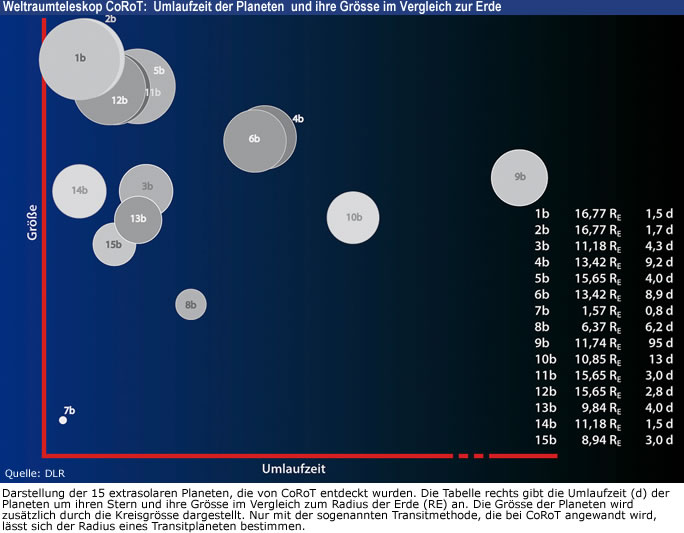 Das Weltraumteleskop CoRoT ist seit Ende 2006 im All und spürt sogenannte Transitplaneten auf. Diese Planeten sind für die Wissenschaft sehr interessant, weil sich nur über sie die Dichte der Planeten bestimmen lässt. Damit lassen sich die Planeten in die Kategorie der Gesteinsplaneten wie Venus, Erde und Mars oder der Gasplaneten wie Jupiter und Saturn einteilen. Transitplaneten gehören zudem zu den am genauesten bekannten Planeten. Von den rund 450 extrasolaren Planeten, die in den vergangenen 15 Jahren entdeckt wurden, sind 82 im Transit zu beobachten. Von diesen Transitplaneten sind 15 durch CoRoT aufgespürt worden.