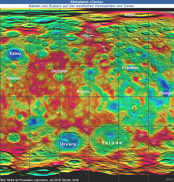 Der auffälligste Krater auf Ceres erhielt den Namen der römischen Gottheit Occator. Im Inneren des 90-Kilometer-Kraters liegen die hellsten Flecken, die man auf Fotos von Zwergplanet Ceres besonders gut erkennt. Krater Urvara, benannt nach der indischen und iranischen Gottheit der Pflanzen und Felder, ist besonders auffällig durch seinen drei Kilometer hohen Berg in der Mitte des 160 Kilometer breiten Einschlagbeckens. Auch der Krater auf dem nullten Längengrad, den die Wissenschaftler des Dawn-Teams nun festgelegt haben, erhielt einen Namen: Er wurde nach Kait, der hethitischen Göttin des Korns, benannt.
