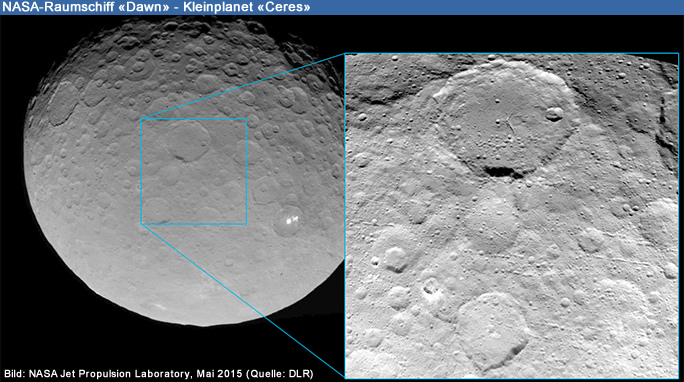 | Im Krater-Inneren sind zudem Risse und Ebenen zu erkennen. Umso näher die Sonde um den Zwergplaneten Ceres kreist, desto mehr Details können die Planetenforscher erkennen - und darüber rätseln, wie diese entstanden sind. Mit seinem Durchmesser von fast 1'000 Kilometern und seiner runden Form ist Ceres ein Himmelskörper, der es bei der Entstehung des Sonnensystems fast bis zu einem Planeten geschafft hätte. Allerdings nur fast, denn die Anziehungskraft von Jupiter, dem grössten Planeten unseres Sonnensystems, hat verhindert, dass Ceres mehr Material einsammeln konnte und so zum Planet wurde. 2006 von der Internationalen Astronomischen (Union IAU) zu einem der insgesamt fünf offiziellen Zwergplaneten ernannt, wird mit Ceres nun zum ersten Mal ein Himmelskörper dieser Kategorie aus dem Orbit untersucht. "Wir haben mit der Dawn-Mission die Gelegenheit, in Ruhe auf die Anfänge unseres Sonnensystems zu schauen", betont DLR-Planetenforscher Ralf Jaumann. |