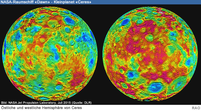 Seit dem 13. August 2015 fliegt Dawn in ihrem bisher niedrigsten Orbit um Zwergplanet Ceres. Mittlerweile hat sie ihren ersten elftägigen Orbit einmal um den Himmelskörper vollendet und Bilder aus einer Höhe von 1'470 Kilometern über der Oberfläche gesendet. Insgesamt sechs Mal wird die Kamera die gesamte Oberfläche von Ceres aufnehmen und dabei jeweils in leicht unterschiedlichen Winkel auf den Zwergplaneten blicken. Mit diesen Stereoaufnahmen verfeinern die DLR-Planetenforscher dann auch ihr dreidimensionales Geländemodell. Ende Oktober wird es dann zunächst einmal keine neuen Bilder geben, bis Dawn zwei Monate später den letzten und niedrigsten Orbit in einer Höhe von 375 Kilometern erreicht.