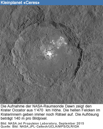 Mit den Aufnahmen der Kamera erstellen die Wissenschaftler des DLR-Instituts für Planetenforschung ein Geländemodell von Ceres, das den Zwergplaneten auch mit der dritten Dimension, der Höhe, zeigt. Dieses Geländemodell war auch die Basis für ein Video, bei dem der Zuschauer um den mächtigen Occator-Krater mit seinem Durchmesser von 90 Kilometern kreist. Dabei wurden die Höhen um den Faktor 1,5 überzeichnet, um die Topographie des Kraters zu verdeutlichen. Insgesamt 6'000 Meter beträgt der Unterschied vom tiefsten bis zum höchsten Punkt. In der Mitte: die geheimnisvollen hellen Flecken, über deren Entstehung und Beschaffenheit die Wissenschaftler noch diskutieren.