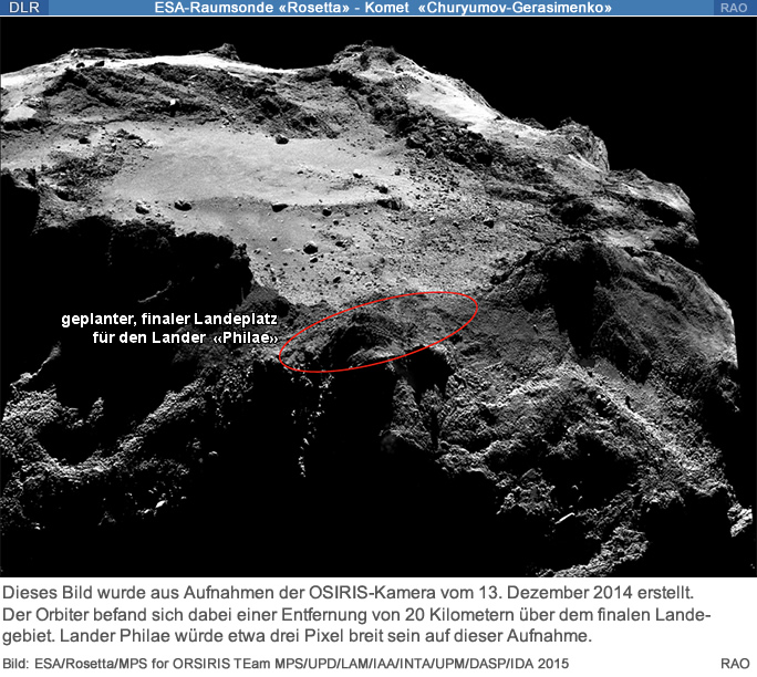 Mit dem Instrument CONSERT grenzten die Wissenschaftler den finalen Standort von Philae immerhin auf ein Gebiet von etwa 350 mal 30 Metern ein. Die exakte Position konnte jedoch noch nicht ermittelt werden. Auf den Aufnahmen der OSIRIS-Kamera aus 20 und 30 Kilometern Entfernung zeigte sich der Lander nicht. Vor allem während der Kometentage, während der Lander von der Sonne 1,3 Stunden angestrahlt wurde, richteten die Wissenschaftler ihre Kamera immer wieder auf das Landegebiet aus. Doch der gerade kühlschrankgrosse Lander Philae würde nur einen Durchmesser von drei Pixeln auf den Aufnahmen haben - es ist eine Suche nach der Nadel im Heuhaufen.