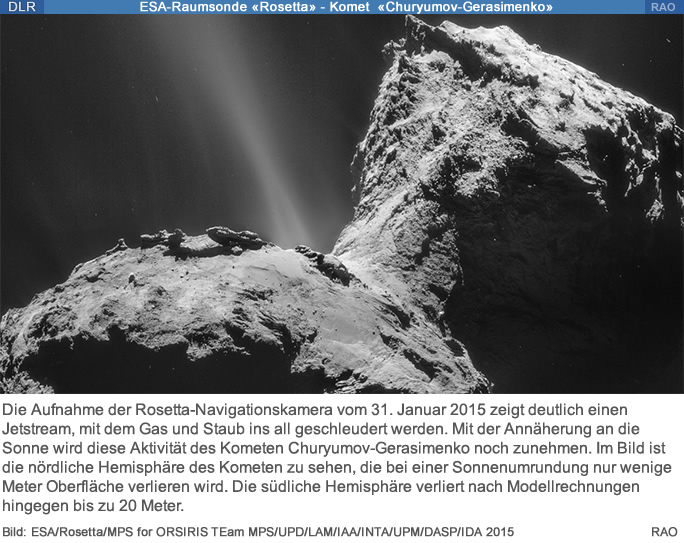 Am 3. Februar 2015 verliess Rosetta ihre bisherige Orbitposition, 26 Kilometer vom Kometen 67P/Tschurjumow-Gerasimenko entfernt, und beendete damit ihre aktuelle Begleitphase. Ab sofort beginnt für die Mission eine neue Flugphase, die den Rest des Jahres andauern wird.