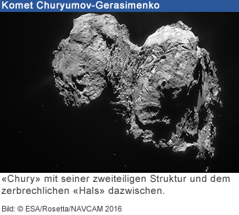 | Komet «Chury» hat seine entenförmige Gestalt nicht bei der Entstehung unseres Sonnensystems vor 4,5 Milliarden Jahren erhalten wie bisher gedacht. Dies schliessen Astrophysiker der Universität Bern aus Computersimulationen. Sie zeigen, dass der Komet in seiner jetzigen Form kaum mehr als eine Milliarde Jahre ist. Trotzdem enthält er Material aus der Urzeit.