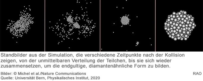 An dieser Stelle kam Martin Jutzi ins Spiel, dessen Spezialgebiet 3D-Simulationen von Kollisionen sind. Damit hat Jutzi in der Vergangenheit unter anderem auch nachgewiesen, dass der Komet Churyumov-Gerasimenko viel jünger ist als angenommen, und er konnte die Entstehung der Saturnmonde klären, die aussehen wie kosmische Ravioli und Spätzli. «Für die aktuelle Studie habe ich die Kollisionen eines potenziellen Mutter-Asteroiden mit anderen Objekten modelliert und berechnet, wie sich dies auf die Dichte der Fragmente auswirken könnte», erklärt er. Mit Hilfe seiner Berechnungen konnte das Team zeigen, dass sich die Kollisionsfragmente wieder zusammensetzen und die Diamantenform bilden können.