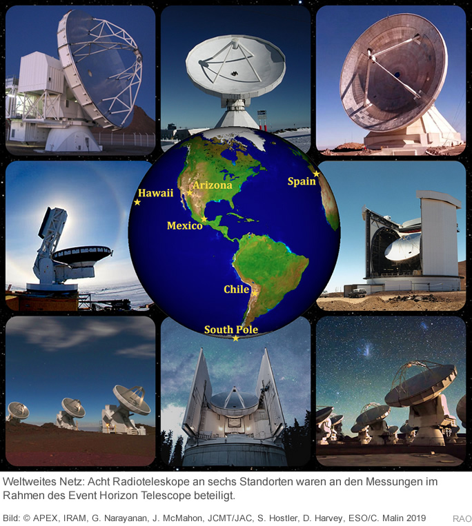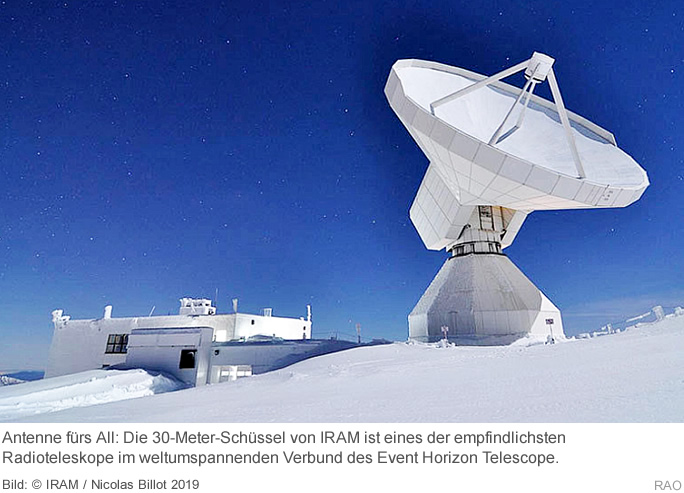 Erstmals haben Forscher den Schatten eines schwarzen Lochs beobachtet. Es steckt in der Galaxie Messier 87 und wurde mit dem Event Horizon Telescope unter die Lupe genommen. Zu einem Riesenteleskop verbunden sind darin insgesamt acht Observatorien auf der ganzen Welt, von Europa über Chile und Hawaii bis hin zum Südpol. Das 30-Meter-Teleskop des Instituts für Radioastronomie im Millimeterbereich (IRAM) in der spanischen Sierra Nevada, einer von der Max-Planck-Gesellschaft mitfinanzierten Einrichtung, nahm als einzige Station in Europa an der Beobachtungskampagne teil.