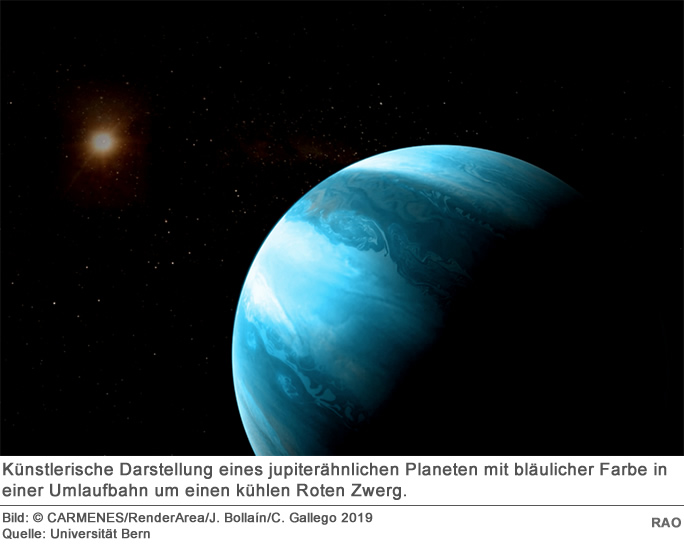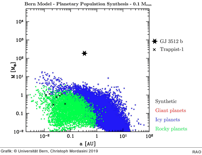 Der rote Zwergstern GJ 3512 befindet sich rund 30 Lichtjahre von uns entfernt. Obwohl er nur ein Zehntel so viel Masse wie die Sonne hat, besitzt er einen Riesenplaneteneine unerwartete Beobachtung. «Es sollte um solche Sterne eigentlich nur erdgrosse Planeten oder höchstens etwas massereichere Super-Erden geben», sagt Professor Christoph Mordasini vom Physikalischen Insitut der Universität Bern und Mitglied des Nationalen Forschungsschwerpunkts PlanetS: «GJ 3512b ist hingegen ein Riesenplanet mit einer Masse ungefähr halb so gross wie diejenige von Jupiter, und somit mindestens eine Grössenordnung massereicher als die Planeten, die von theoretischen Modellen für so kleine Sterne vorausgesagt werden.»