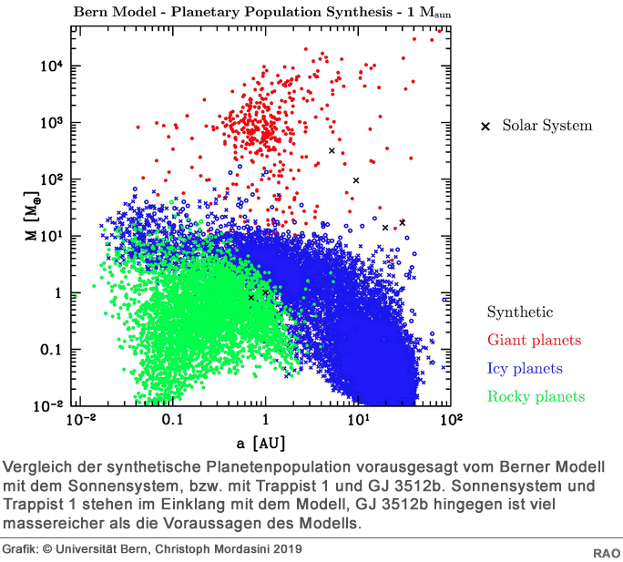 «Unser Modell zur Entstehung und Entwicklung von Planeten sagt voraus, dass bei kleinen Sternen eine grosse Zahl von kleinen Planeten gebildet werden», fasst Mordasini zusammen und führt als Beispiel ein anderes, bekanntes Planetensystem an: Trappist-1. Bei diesem Stern, der mit GJ 3512 vergleichbar ist, existieren sieben Planeten mit Massen, die ungefähr einer Erdmasse oder sogar weniger entsprechen. In diesem Fall stimmen die Berechnungen des Modells gut mit der Beobachtung überein. Nicht so bei GJ 3512. «Unser Modell sagt voraus, dass es um solche Sterne gar keine Riesenplaneten geben sollte», sagt Mordasini. Eine mögliche Erklärung für das Versagen der gängigen Theorie könnte der Mechanismus sein, der dem Modell zugrunde liegt, die sogenannte Kernakkretion. Dabei entstehen Planeten, indem sie schrittweise durch Ansammlung von kleinen Körpern zu immer grösseren Massen wachsen. Die Fachleute nennen dies einen «bottom-up-Prozess».