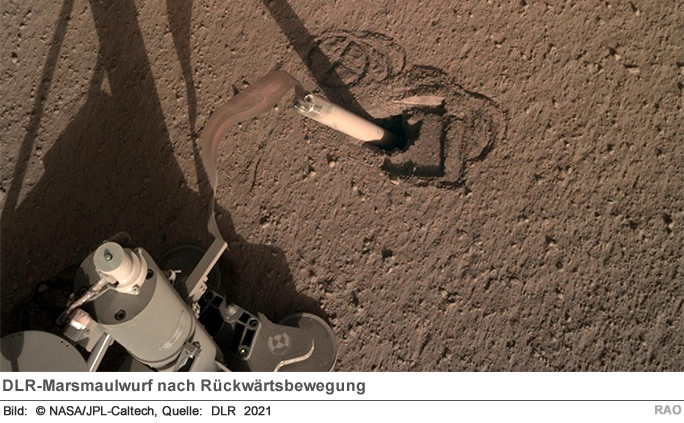 Zwei Jahre lang hat der Mars-Maulwurf versucht, sich tiefer in den Boden einzugraben. Jetzt ist seine Reise zu Ende. Wissenschaftler und Ingenieure am Deutschen Zentrum für Luft- und Raumfahrt (DLR) und am Jet Propulsion Laboratory (JPL) haben bis zuletzt daran gearbeitet, den "Mole" (Maulwurf) zum Graben in die Zieltiefe von fünf Metern zu bringen. Der Maulwurf vom DLR, der an Bord der NASA-Landesonde InSight zum Mars geflogen ist, sollte unterhalb der Mars-Oberfläche Temperatur und Wärmefluss messen. Das InSight-Team am JPL der NASA in Pasadena (Kalifornien, USA) hat in den vergangenen Monaten den Maulwurf mit dem robotischen Arm der InSight-Sonde noch unter die Oberfläche bekommen und seitliche Hohlräume mit Marsboden verfüllt. Durch die zusätzliche seitliche Reibung sollte der Maulwurf weiter vordringen können. Nach sorgfältiger Vorbereitung brachten leider auch 500 Hammerschläge am vergangenen Samstag, 9. Januar 2021, keinen erkennbaren Fortschritt