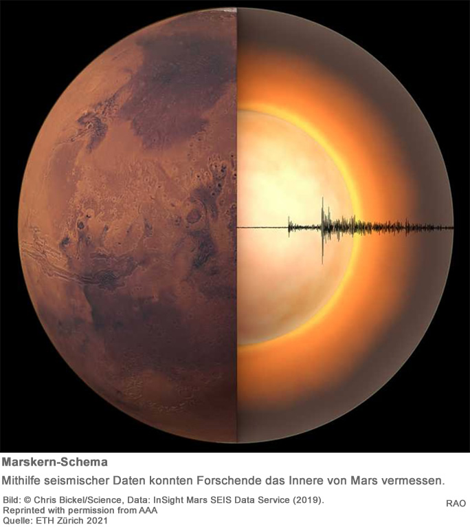 Die Messungen zeigen zudem, dass der Marsmantel mineralogisch dem oberen Erdmantel gleicht. «So gesehen ist der Marsmantel eine simplere Version des Erdmantels», so Khan. Die Seismologie enthüllt aber auch Unterschiede in der chemischen Zusammensetzung. Der Marsmantel enthält zum Beispiel viel mehr Eisen als jener der Erde. Wie kompliziert man sich die Schichtung des Marsmantels vorstellen muss, hängt aber auch von der Grösse des darunterliegenden Kerns ab und auch hier gelangten die Forschenden zu neuen Erkenntnissen.