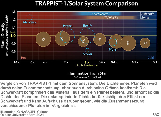 In unserem eigenen Sonnensystem sind die Dichten der acht Planeten sehr unterschiedlich. Die von Gas dominierten Riesen Jupiter, Saturn, Uranus und Neptun sind grösser, aber viel weniger dicht als die vier Gesteinsplaneten Erde, Venus, Mars und Merkur. Die sieben TRAPPIST-1-Planeten hingegen haben alle eine ähnliche Dichte und Grösse, wodurch sich das System deutlich von unserem unterscheidet. Dass die Planeten um TRAPPIST-1 alle eine ähnliche Dichte haben, könnte bedeuten, dass sie alle ungefähr dieselbe Zusammensetzung an Materialien enthalten (wie Eisen, Sauerstoff, Magnesium und Silicium). Da die Planeten ungefähr 8% weniger dicht sind als die Erde, ist davon auszugehen, dass sich ihre Zusammensetzung von derjenigen unseres Heimatplaneten unterscheidet. Basierend auf dieser Schlussfolgerung stellten die Autorinnen und Autoren der Studie eine Hypothese auf, welche Mischung von Bestandteilen den TRAPPIST-1-Planeten diese spezifische Dichte verleihen könnte.