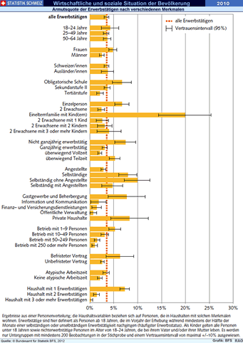 Auch im Hinblick auf die materielle Versorgung, die durch die Quote der erheblichen materiellen Entbehrung gemessen wird, sind die Erwerbstätigen in der Schweiz gut gestellt: Die Quote der Schweiz liegt mit 1,1 Prozent deutlich unter dem Durchschnitt aller europäischen Länder (5,2 Prozent) und auch unterhalb derjenigen der direkten Nachbarländer (Italien 4,4 Prozent, Frankreich 3,6 Prozent, Deutschland 2,7 Prozent, Österreich 2,6 Prozent).