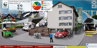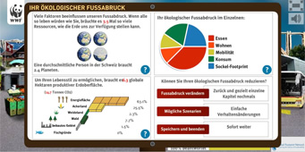 Die Benutzer des Rechners erfahren darum auch, wie sie ihren ökologischen Fussabdruck verkleinern können. Wer zum Beispiel seine Autokilometer bei durchschnittlicher Fahrleistung halbiert, reduziert seinen Footprint alleine damit um 0,3 Planeten. Auch kleine Verhaltensänderungen können einen spürbaren Beitrag leisten. Im Footprint-Rechner lassen sich diese Szenarien durchspielen - als erster Schritt zur Umsetzung.
