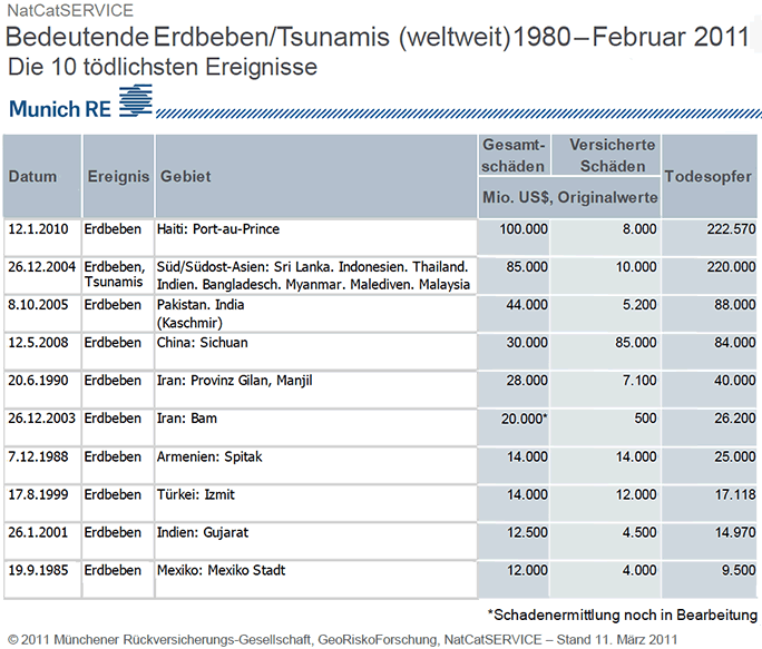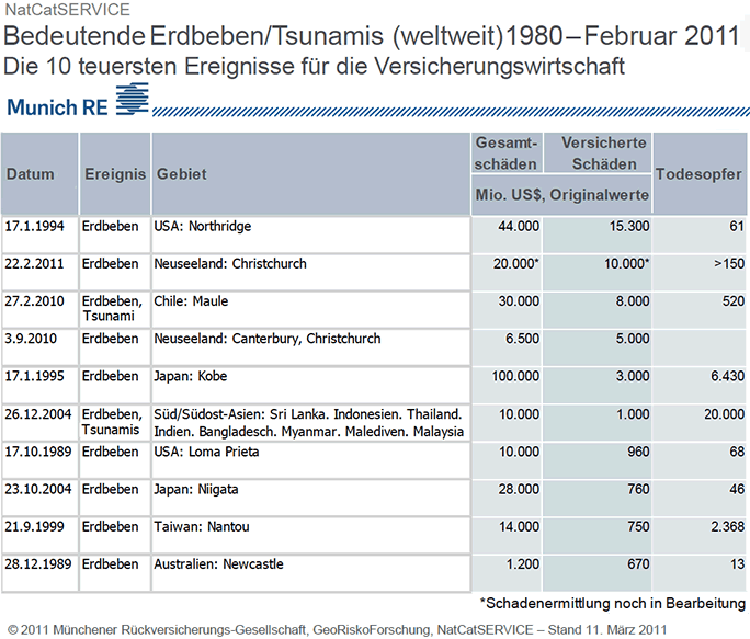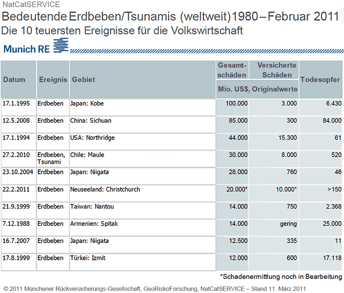 Die 10 teuersten und tödlichsten Ereignisse weltweit 1989 - 2011