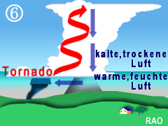 | Tornados bilden sich an der Luftmassengrenze zwischen warmer Luft und kalter Luft. Je grösser der Temperaturunterschied zwischen den beiden Luftmassen ist, desto eher können sich Superzellen bilden. Superzellen sind rotierende Gewittersysteme, aus denen die Tornadoschläuche herauswachsen. Superzellen besitzen sehr hohe Energie. |