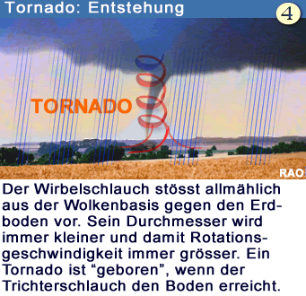 | Tornados bilden sich an der Luftmassengrenze zwischen warmer Luft und kalter Luft. Je grösser der Temperaturunterschied zwischen den beiden Luftmassen ist, desto eher können sich Superzellen bilden. Superzellen sind rotierende Gewittersysteme, aus denen die Tornadoschläuche herauswachsen. Superzellen besitzen sehr hohe Energie. |
