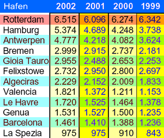 Die Zuwachsraten in Europa fielen in Europa bescheidener aus als in Südostasien. 2002 lag Rotterdam (Niederland), der grösste Containerhafen in Europa auf Rang 7 (2016: 11. Rang, Zuwachs in TEU seit 2002: +91%) der weltgrössten Containerhäfen, Hamburg (Deutschland) auf Rang 9 (2016: 15. Rang, Zuwachs in TEU seit 2002: +65%) und Antwerpen (Belgien) auf Rang 11 (2016: 16. Rang), Zuwachs in TEU seit 2002: +108%). Dem Hafen von Hamburg entwickelte sich in unmittelbarer Nachbarschaft ein Konkurrent. In Wilhelmshaven wurde der Jadeweserport zu einem Tiefseehafen ausgebaut.