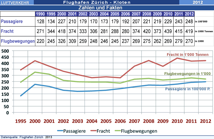 Im Jahr 2012 haben 24'8 Millionen Passagiere den Flughafen Zürich benutzt. Damit wurde der Rekord des Vorjahres um 1.9% übertroffen. Die Anzahl der Flugbewegungen ging um 3.2% zurück. Die Flugzeuge waren im Durchschnitt grösser und besser ausgelastet.
