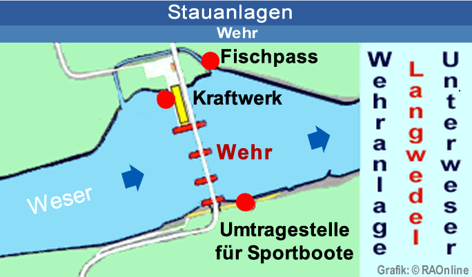 Wehranlage hat die Aufgabe, das Flusswasser für die Schifffahrt auf