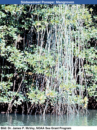 und Salzwasser, zu wachsen. Mit ihren Stütz- oder Stelzwurzeln können sich im schlammigen Untergrund gut verankern. |