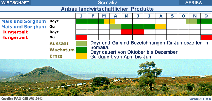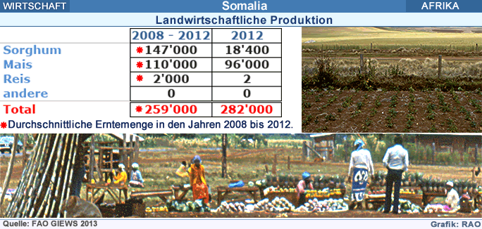 2013 blieben die Ernteerträge in Zentral und Südsomalia infolge von ungünstigen Witterungsbedigungen, dem Ausbruch der Pest-Seuche und der kleiner Anbaufläche unter den Erwartungen. Die Bauern lassen grosse Teile ihrer Landflächen in Zeiten von schwelenden Konflikten aus Sicherheitsgründen unbearbeitet. Schädlinge und Überschwemmungen nach ergiebigen Niederschlägen reduzieren zusätzlich noch die Ernteerträge.
