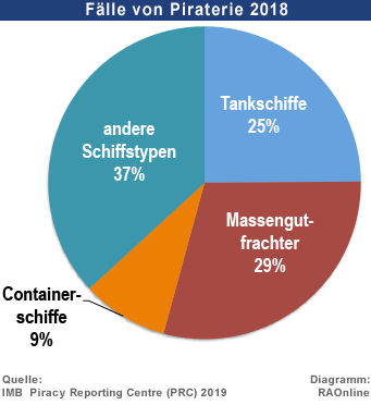 Dem Meldezentrum für Fälle der Piraterie (PRC) des Internationalen Meeresbüros (IMB) wurden 2018 insgesamt 201 Fälle (2017: 180 Fälle) von Piraterie auf den Weltmeeren gemeldet. Das sind 21 Ereignisse oder rund 11,5% mehr Fälle als im Vorjahr.