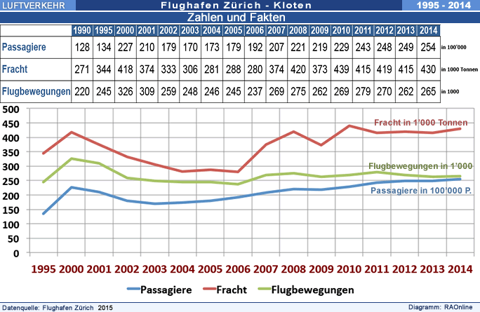 Im Jahr 2014 haben 25.5 Millionen Passagiere den Flughafen Zürich benutzt, was einer Zunahme um 2.5% entspricht. Die Anzahl der Flugbewegungen stieg um 1.0%. Die Flugzeuge waren im Durchschnitt grösser und besser ausgelastet.