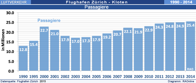 Insgesamt haben im Jahr 2014 25'477'622 Passagiere den Flughafen Zürich benutzt. Im Vergleich zum Vorjahr entspricht dies einer Zunahme von 2.5%.
