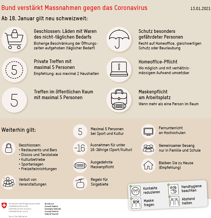 | Der Bundesrat hat zum einen die im Dezember beschlossenen Massnahmen um fünf Wochen verlängert: Restaurants, Kulturbetriebe, Sportanlagen und Freizeiteinrichtungen bleiben bis Ende Februar geschlossen. Zum anderen hat er neue Massnahmen beschlossen, um die Kontakte drastisch zu reduzieren: Neu gilt ab Montag, 18. Januar 2020 eine Home-Office-Pflicht, Läden für Güter des nicht-täglichen Bedarfs werden geschlossen, private Veranstaltungen und Menschenansammlungen werden weiter eingeschränkt und der Schutz von besonders gefährdeten Personen am Arbeitsplatz wird verstärkt. |