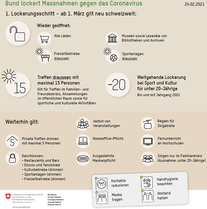 | Ab Montag, 1. März 2021, können Läden, Museen und Lesesäle von Bibliotheken wieder öffnen, ebenso die Aussenbereiche von Sport- und Freizeitanlagen, Zoos und botanischen Gärten. Im Freien sind Treffen im Familien- und Freundeskreis sowie sportliche und kulturelle Aktivitäten mit bis zu 15 Personen wieder erlaubt. Jugendliche und junge Erwachsene bis 20 Jahre können den meisten sportlichen und kulturellen Aktivitäten wieder nachgehen. Dies hat der Bundesrat an seiner Sitzung vom 24. Februar 2021 nach Konsultation der Kantone entschieden. Der nächste Öffnungsschritt soll am 22. März erfolgen, wenn es die epidemiologische Lage erlaubt. |