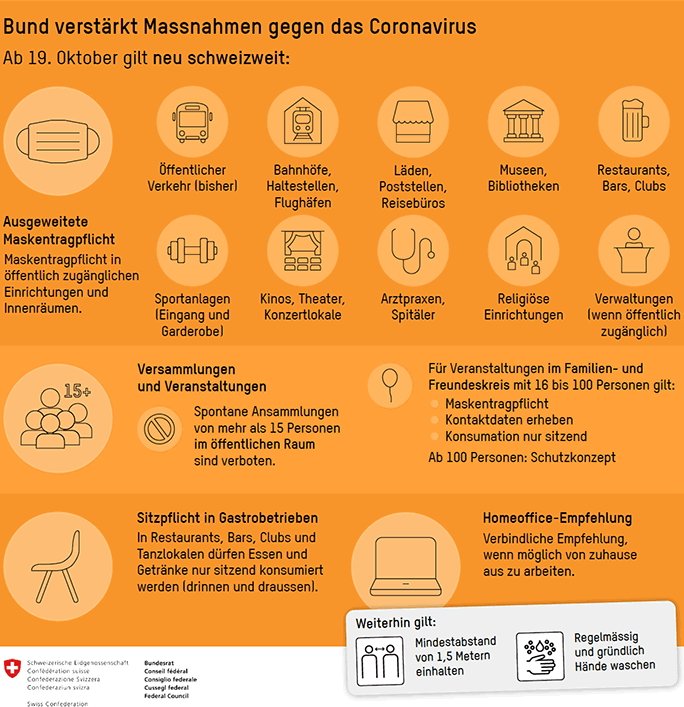 Der Bundesrat hat an einer ausserordentlichen Sitzung am 18. Oktober 2020 mehrere, schweizweit gültige Massnahmen gegen den starken Anstieg der Infektionen mit dem Coronavirus ergriffen.