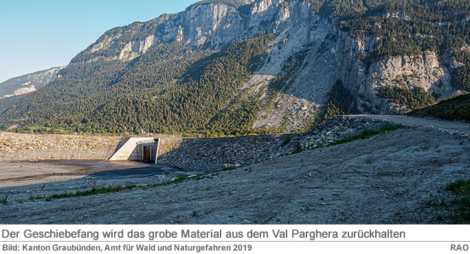 Das neue Schutzbautensystem, das nun offiziell der Gemeinde Domat/Ems übergeben wurde, besteht aus vier Teilen. Herzstück ist der neue Geschiebefang mit einem Fassungsvermögen von 170 000 Kubikmetern. Hinzu kommen ein Abflusskanal in den Rhein, Leitdämme am Kegelhals sowie Wildbachsperren im Bachlauf. Die Grösse des neuen Geschiebefanges stützt sich einerseits auf die Erfahrungen des aktuellen Ereignisses, andererseits auf die Erkenntnis, dass im Einzugsgebiet der Val Parghera weitere Stellen rutschgefährdet sind. Für die Bemessung des Fassungsvermögens von 170 000 Kubikmeter waren die Jahresfrachten von 90 000 bis 260 000 Kubikmeter und die Tagesfrachten von bis zu 20 000 Kubikmeter entscheidend. Während der Interventionsphase und für den Bau der Notbrücke fielen im Jahr 2013 Aufwendungen von sieben Millionen Franken an, für die Bewältigung und das Deponieren der über Jahre andauernden Murgänge sowie für die Realisierung des Schutzbautensystems ist bis Ende 2019 zusätzlich mit Kosten von rund 19 Millionen Franken zu rechnen. Die Bewältigung des Naturereignisses in der Val Parghera wird insgesamt rund 26 Millionen Franken kosten. Damit wird der Kostenvoranschlag von knapp 33 Millionen Franken unterschritten.