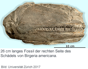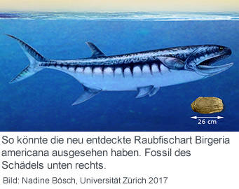 Nun haben schweizerische und US-amerikanische Forschende unter der Leitung des Paläontologischen Instituts und Museums der UZH die fossilen Überreste eines der frühesten grossen Raubfische der Trias entdeckt: ein ca. 1,8 Meter grosser Knochenfisch mit langen Kiefern und spitzen Zähnen. Dieser gehört zu einer neuen, bisher unbekannten Art namens Birgeria americana. Der Räuber bewohnte bereits eine Million Jahre nach dem weltweiten Artensterben das Meer, das damals das heutige Nevada und benachbarte US-Bundesstaaten bedeckte.