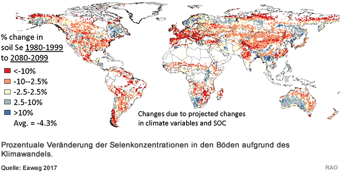 Basierend auf diesen Erkenntnissen modellierten die Forscherinnen und Forscher die durchschnittliche Selenkonzentration der Böden für die Zeiträume von 1980-1999 und 2080-2099. In Teilen von Australien, China, Indien und Afrika werde es aufgrund des Klimawandels zu einer Zunahme des Selenanteils kommen. Insgesamt werde der Selengehalt in den Böden aber abnehmen, folgern die Forschenden: Im Vergleich zu 1980-1999 weisen bis zum Ende dieses Jahrhunderts (2080-2099) 66 % der landwirtschaftlich genutzten Flächen einen durchschnittlichen Selenverlust von rund 9 % auf. Betroffen sind vor allem Ackerflächen in Europa und Indien, China, der Süden Südamerikas, Südafrika und der Südwesten der Vereinigten Staaten .