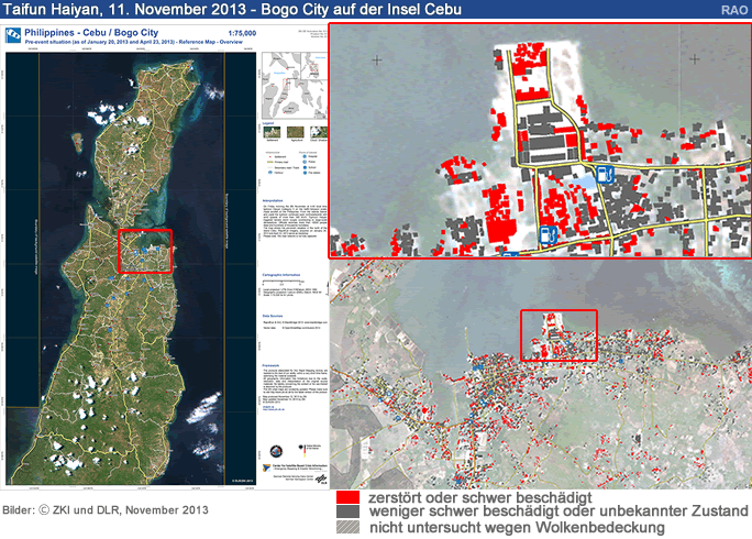 Nachdem am 8. November 2013 der Taifun Haiyan die Inseln erreichte und ganze Gebiete grossflächig zerstörte, aktivierten das Technische Hilfswerk THW über das Bundesministerium des Innern (BMI) und die Internationale Charta "Space and Major Disasters" das Zentrum für satellitengestützte Kriseninformation (ZKI) des DLR.