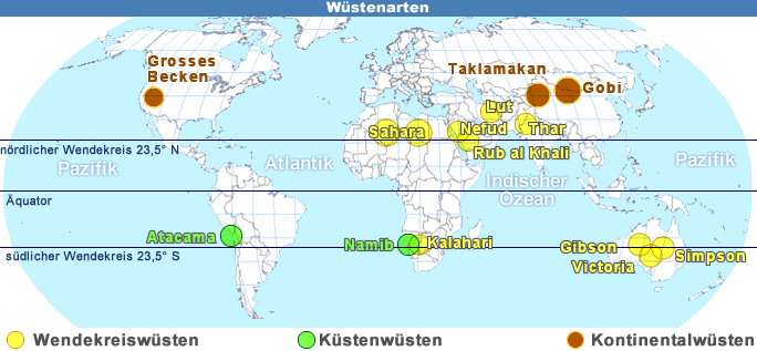 Die Wendekreiswüsten bilden sich als Folge der innertropischen Luftkonvektionsströme. Die in der Innertropischen Konvektionszone aufsteigenden Luftmassen fliessen im Bereich der beiden Wendekreise wieder gegen den Erdboden. Es bilden sich an diesen Stellen ausgeprägte Hochdrucklagen, welche von sonnigem und trockenem Wetter bestimmt werden. |