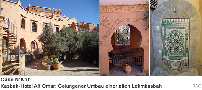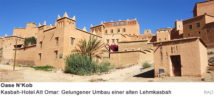 Eine Kasbah» ist eine Wohnanlage, welche meist von wohlhabenden Familien eines Clan bewohnt wurde. Die Kasbah liegt oft am Fusse eines kleinen Hügels, auf dem eine befestigte Wehranlage, «Ksar», errichtet wurde. Die Oase N'Kob am Fuss des Jebel Sarhro besteht aus 45 historischen Kasbahs.