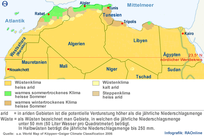 Im Norden wird die Sahara in Marokko und Algerien durch den Anti-Atlas, den Jebel Sarhro und den Sahara Atlas begrenzt. An den Abhängen dieser Gebirgszüge fallen vor allem im Winterhalbjahr bis 250 mm pro Jahr. In Gebieten, wo wenigstens ab zu zu Regen fällt, hat sich die Halbwüste ausgebreitet. In Halbwüsten haben sich Zwergsträucher usw. angesiedelt. Weniger als 50% der Erdoberfläche sind dort mit Pflanzen bedeckt. Vollwüsten gliedern sich in Kern- und in Randwüste. Randwüsten gehen oft fliessend in Wüstensteppen oder Halbwüsten über.