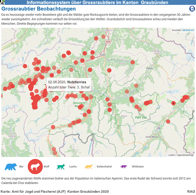 Aktuell konzentriert sich das Interesse auf Vorkommnisse mit Wölfen. In der Surselva treten gleich drei Wolfsrudel regelmässig in Erscheinung. Dies sind das Beverinrudel, das Ringelspitzrudel und das Val Gronda Rudel. Mit der Bildung von weiteren Wolfsrudeln ist zu rechnen. Ausserdem sind in ganz Graubünden Einzelwölfe unterwegs. Von den Herausforderungen im Umgang mit den Grossraubtieren ist die Landwirtschaft in besonderem Mass betroffen. Es konnte festgestellt werden, dass verschiedene Einzelwölfe die Schutzmassnahmen wie Elektrozaun und Herdenschutzhunde der Tierhalter überwinden bzw. überspringen und somit ein sehr problematisches Verhalten aufzeigen. Den Wölfen zum Opfer gefallen sind bisher vor allem Schafe bzw. Lämmer und Ziegen. Aber auch bei Mutterkuhherden haben Landwirte in jüngster Zeit veränderte Verhaltensweisen festgestellt. Die Tiere wirkten nervöser als normal, in Einzelfällen sind verängstigte Tiere aus ihrem Gehege ausgebrochen. Es wird vermutet, dass dies auf die erhöhte Wolfspräsenz zurückzuführen ist. Es ist nicht ausgeschlossen, dass sich damit ein neues Gefahrenpotenzial für die Sicherheit der Personen, die mit den Tieren arbeiten, sowie für Menschen, die sich in die Nähe der Herden begeben, auftut.