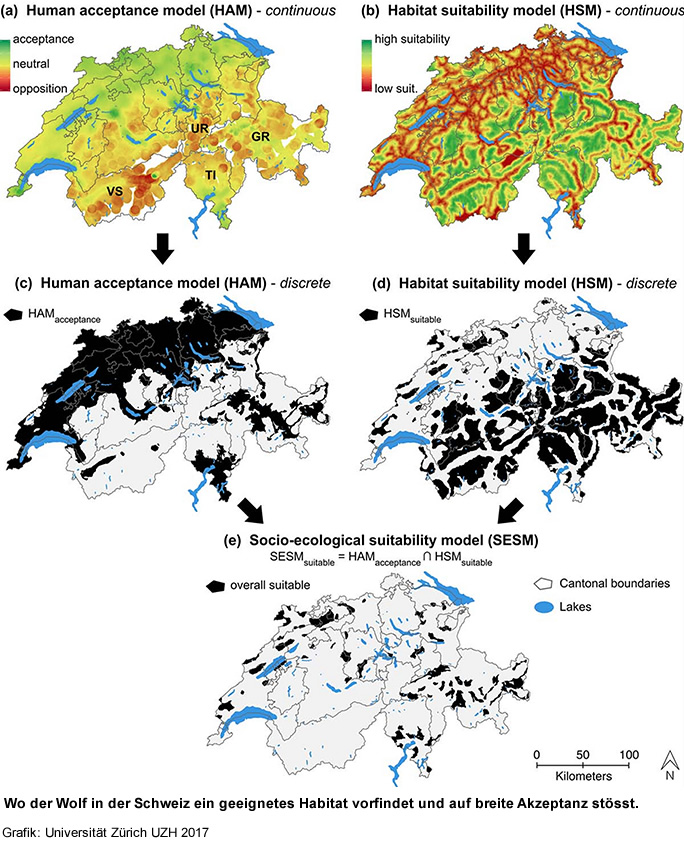 Dominik M. Behr, Arpat Ozgul, Gabriele Cozzi. Combining human acceptance and habitat suitability in a unified socio-ecological suitability model: a case study of the wolf in Switzerland. Journal of Applied Ecology. February 17, 2017. doi 10.1111/1365-2664.12880